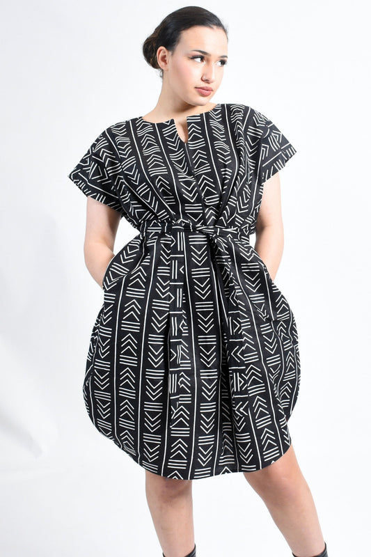 African Print Caftan Dress with Pockets- Black & White Bogolan Print