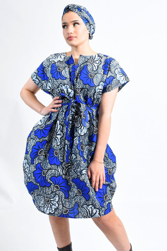 African Print Caftan Dress with Pockets- African Blue Wedding Flowers Print