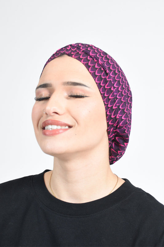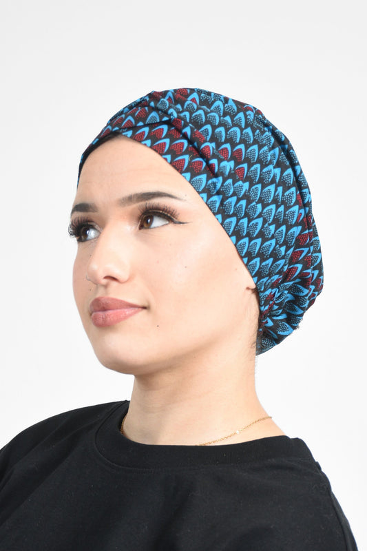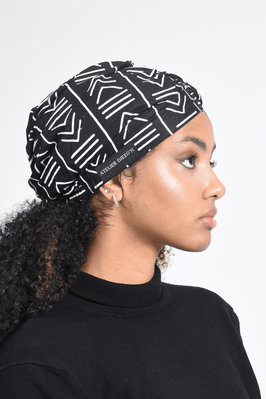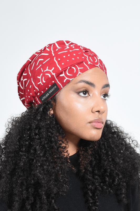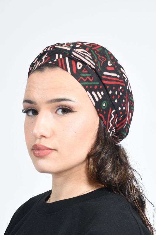 Satin Lined Beanie in Green Red and Black Bogolan Print