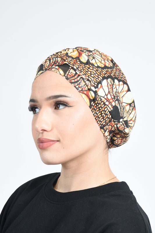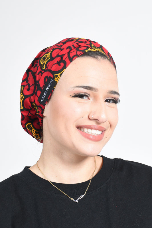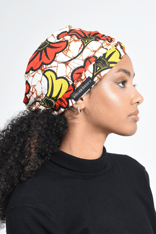 Satin Lined Beanie in African print Wedding Flowers Red and Yellow